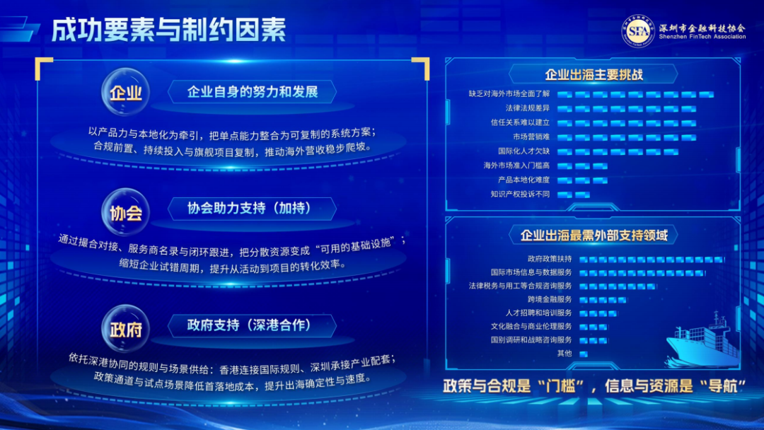 《报告》案例均源自深圳企业出海一线实践,腾讯云、保联科技、华锐技术等典型企业经验亦被收录:腾讯云打造 “金融级全球化云底座”,服务覆盖 70 多个国家和地区的金融机构,其跨境支付解决方案与智能客服应用显著提升客户运营效率;保联科技在港设立子公司后,已成功为 4 家香港保险经纪公司上线核心业务系统,其中包括香港保费规模排名第一的保险经纪公司,实现超 500 万元营业收入;华锐技术以香港为支点,自主研发的分布式技术平台成功替代国际供应商,服务头部中资券商覆盖全球 60 多个市场的证券交易。这些案例不仅展现深圳金融科技企业的技术实力,更凸显 “以香港为起点” 的出海策略优势,为行业协同出海提供实践借鉴。